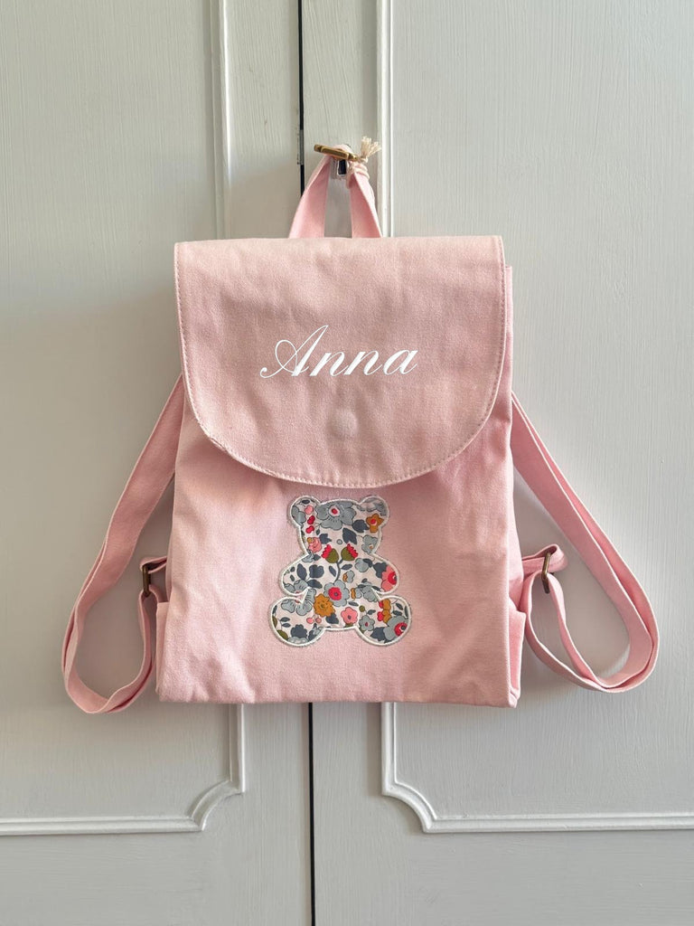 - Zainetto in cotone disponibile in 3 colori (rosa, ecrù e blu), personalizzabile con applicazione a scelta e nome ricamato.