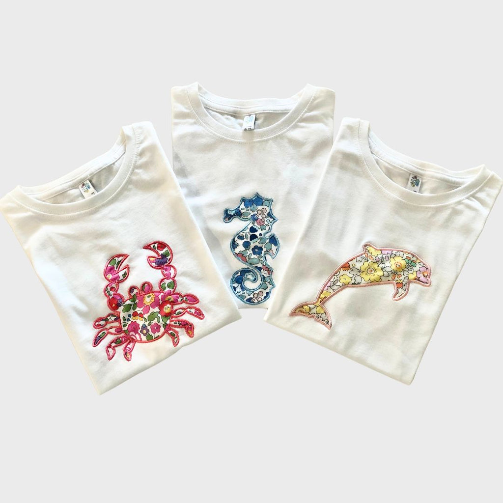 Maglietta semplice ma allo stesso tempo elegante perché arricchita da una simpatica applicazione che scegli TU, in questo caso a tema mare.